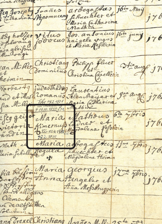 Auch in Vorarlberg war der Name Kümmernis im 18. und 19. Jahrhundert geläufig. Im Matrikenbuch der Pfarre Mittelberg aus den Jahren 1748-1788 finden sich drei Mädchen, die auf den Namen Maria Kümernuß, Juliana Kümernus oder Maria Comernus getauft wurden.