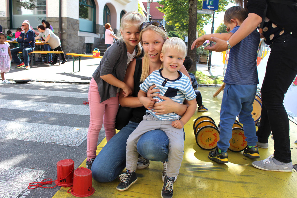 Laura, Mama Michaela und Lukas versuchten sich beim Pedalospiel.