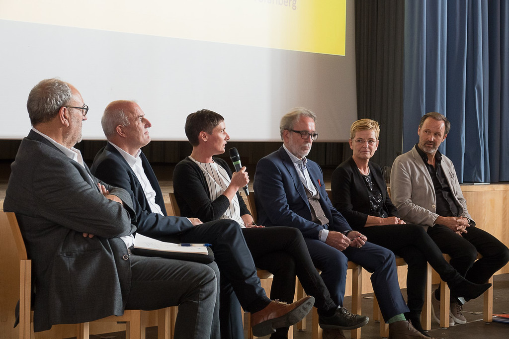 Plenumsdiskussion: Josef Watschinger, Prof. Helga Kohler-Spiegel, Prof. Theo Wehner, Emilia Peter, Andreas Kappaurer und Hanno Metzler.