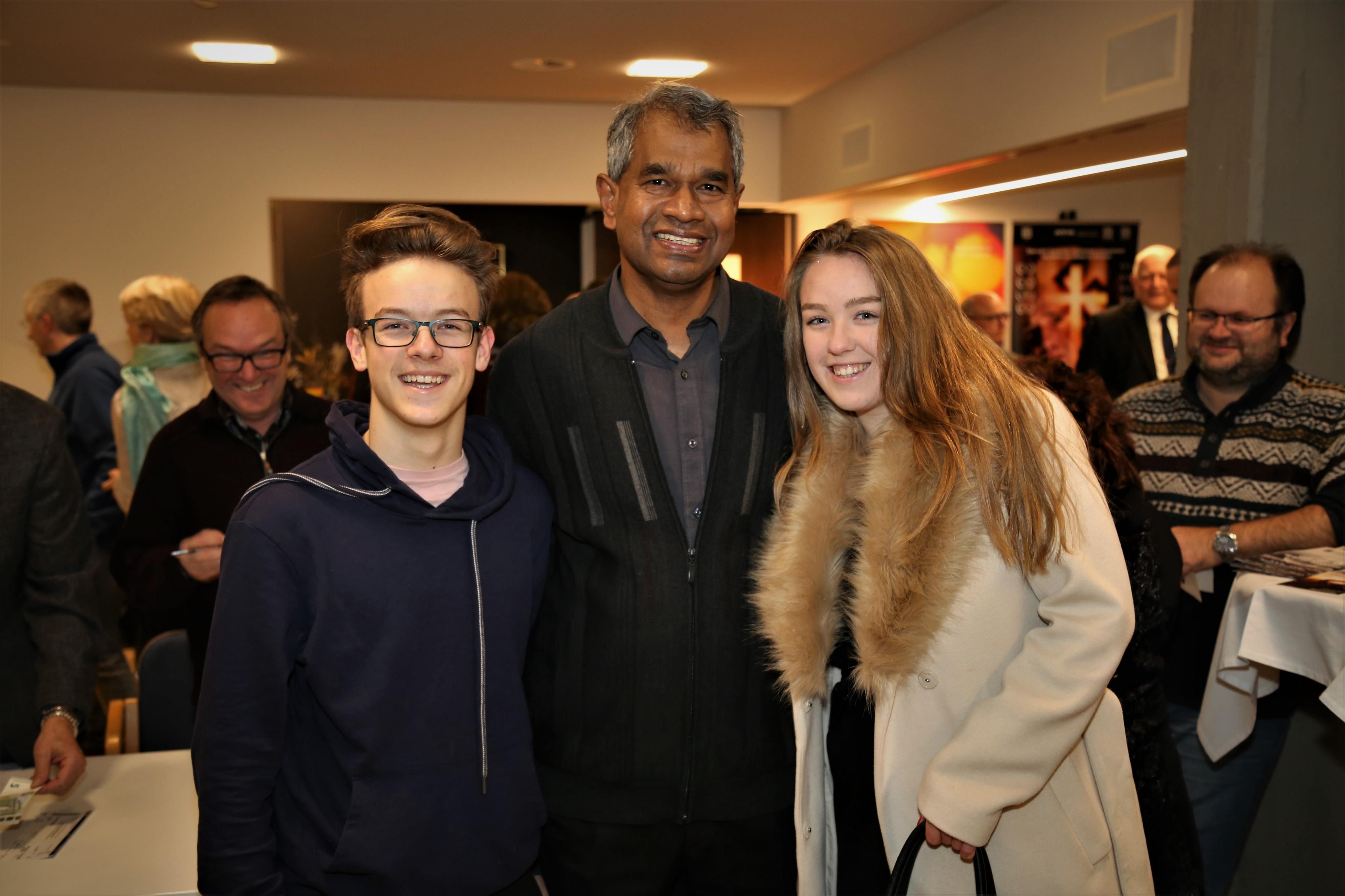 Zwillinge Jonas und Clarissa Bentele mit Pfarrer Georg Thaniyath