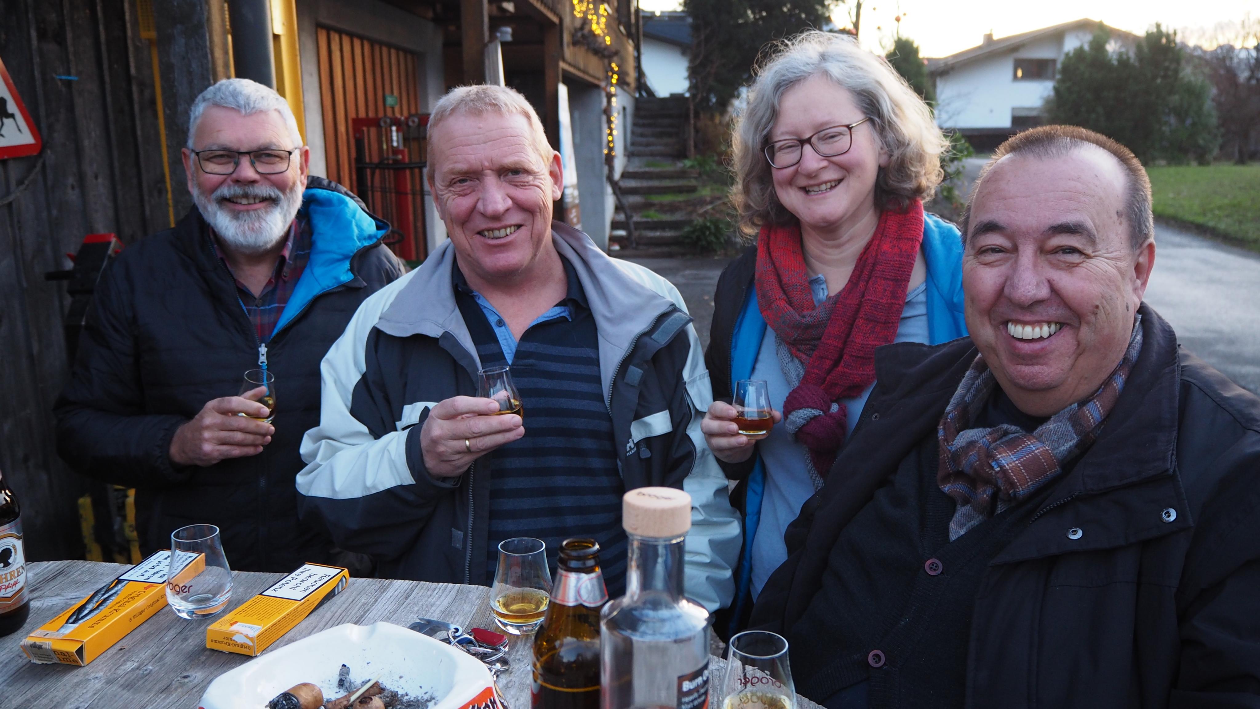 Einen Schluck in gemütlicher Runde: Walter, Martin, Elisabeth und Eckart