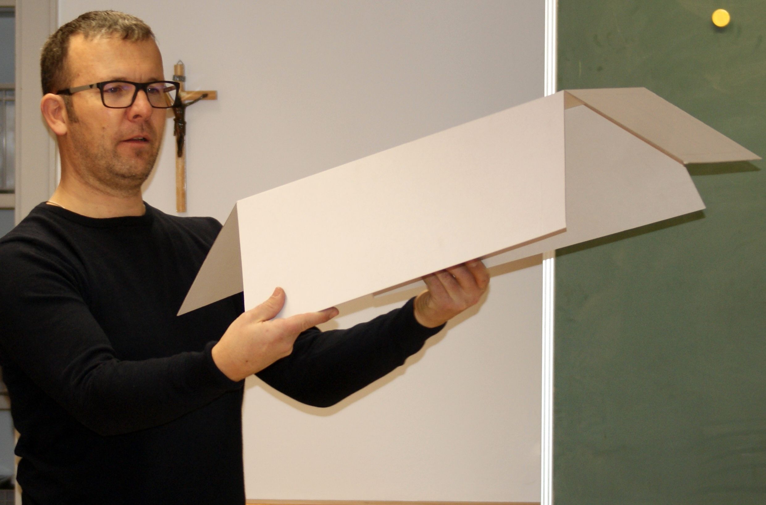Initiator Christian Tomasini führt das faltbare LKW – Modell näher aus.