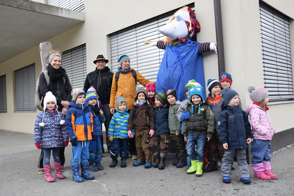 Die Kindergärtler mit Hexe "Wackelzahn" beim Dorfhaus