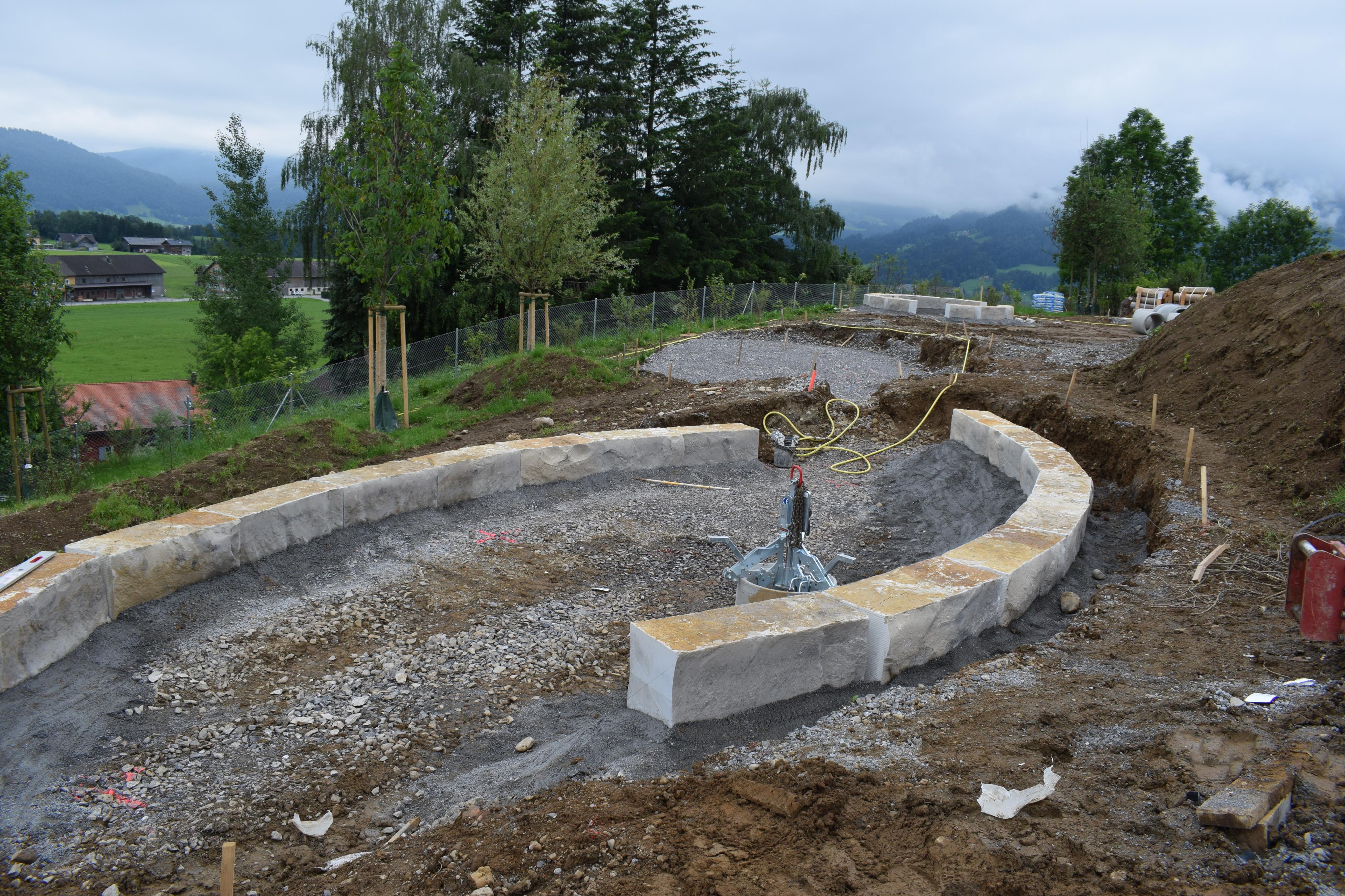 Eien riesige Sandkiste mit Sitzgelegenheit aus Jura Kalkstein soll zum Spielen animieren.