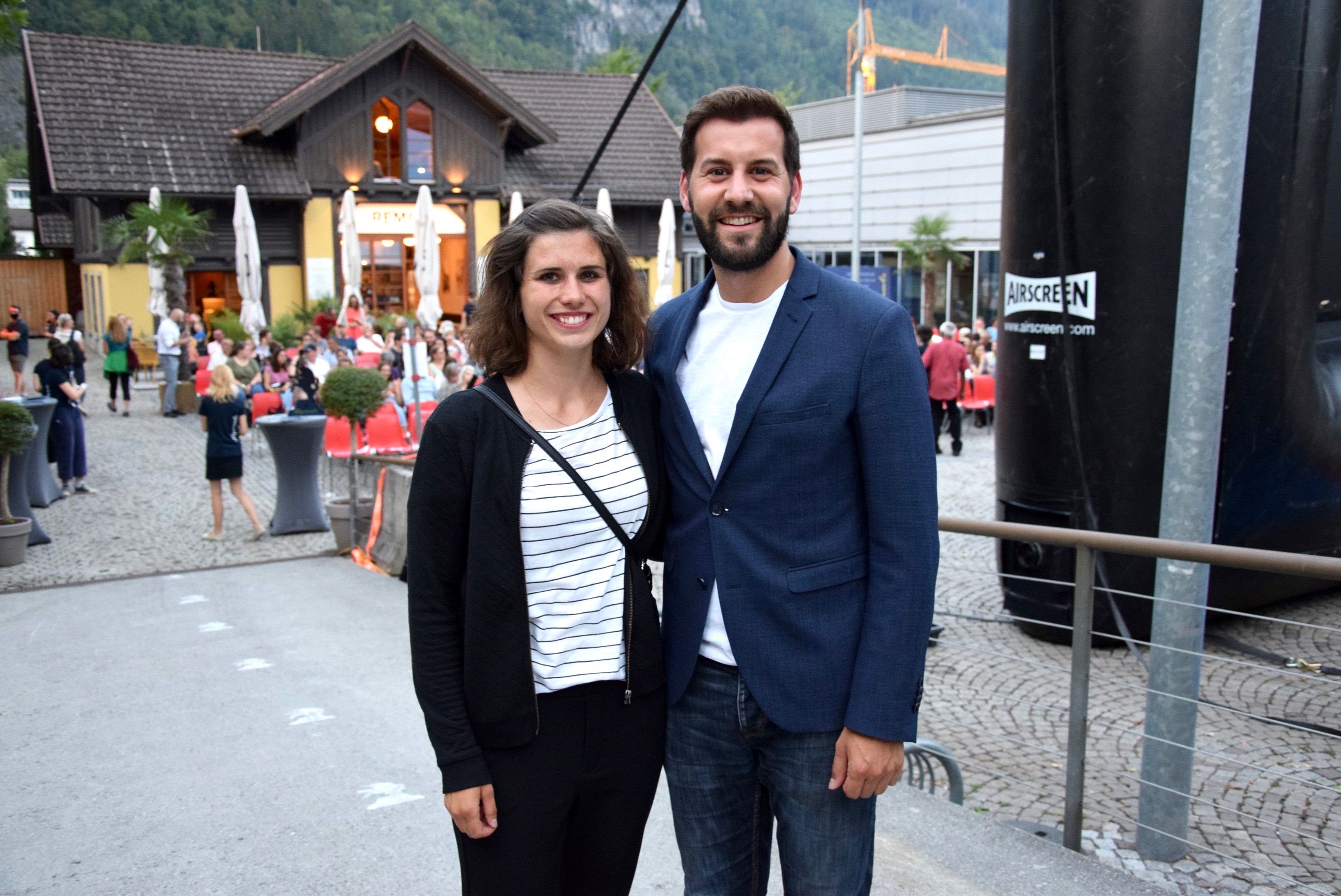 Bürgermeisterkandidat Simon Tschann mit Melina Heinzelmaier am Eröffnungsabend der Alpinale am Raiffeisenplatz in Bludenz