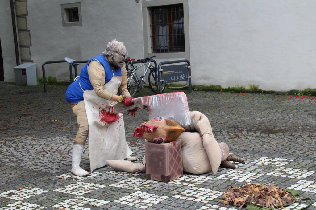 Bissiges Straßentheater mit Huhn