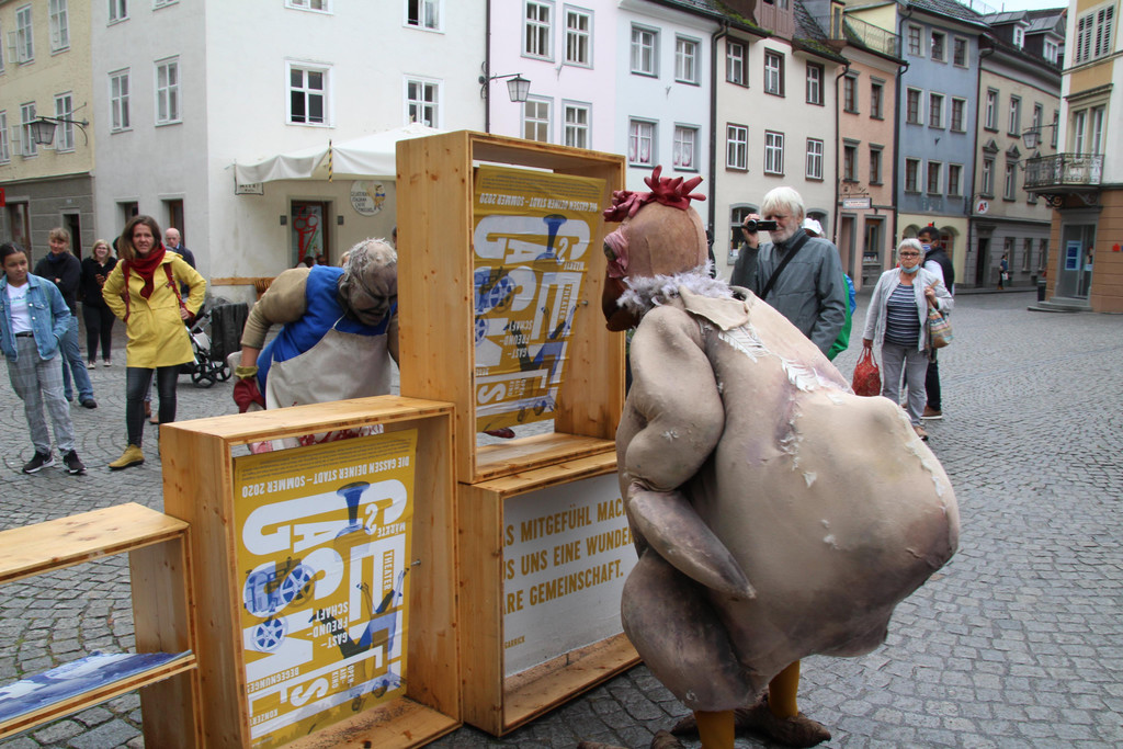 Bissiges Straßentheater mit Huhn
