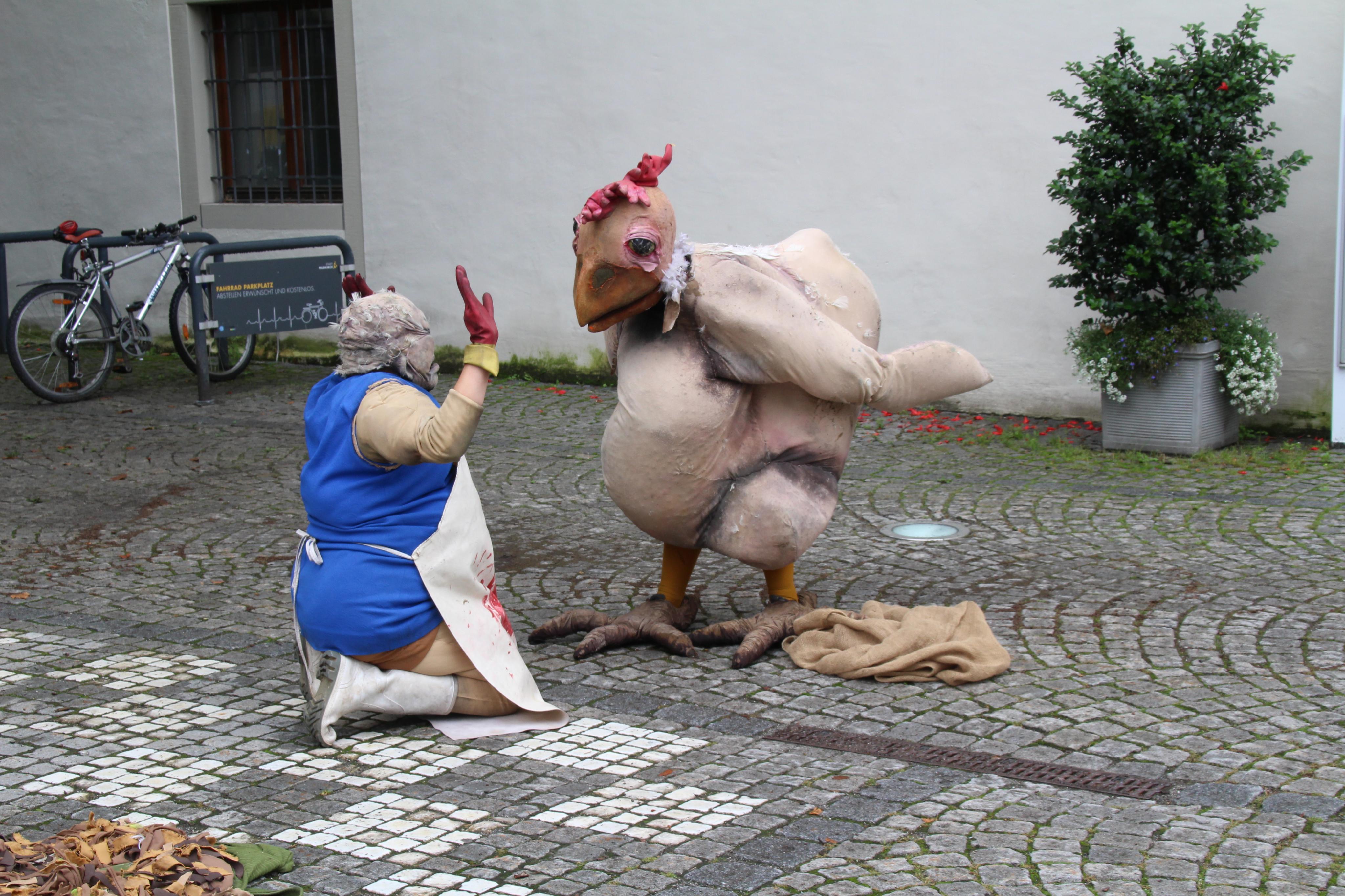 Bissiges Straßentheater mit Huhn
