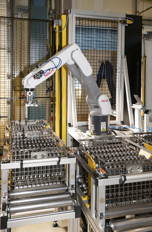 Der Nachi-Roboter greift sich ein Pleuel und bestückt damit die Fertigungsmaschine.