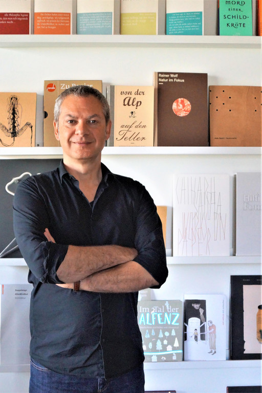 Der Künstler vor einen gestalteten Büchern