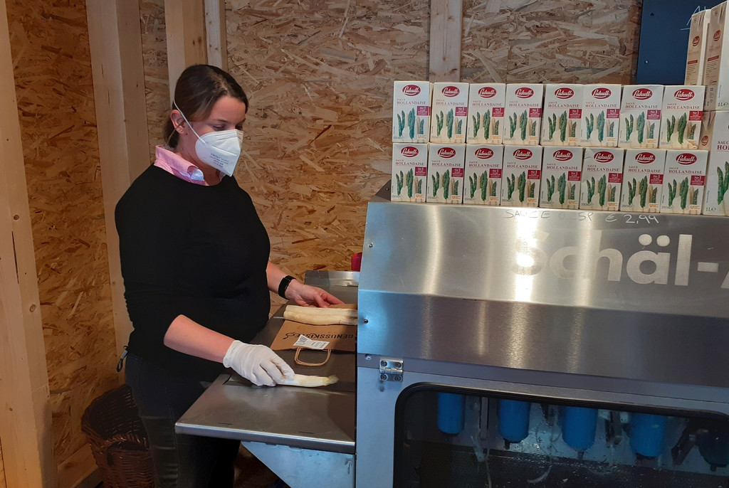 Spargel-Zeit in der „Genusskiste“ im Obsthof Leiblachtal: Ob Hofspargel, Spargel Klasse 1 oder Grüner Spargel, mit der praktischen Spargelschälmaschine wird „das Spargelschälen“ leicht gemacht.
