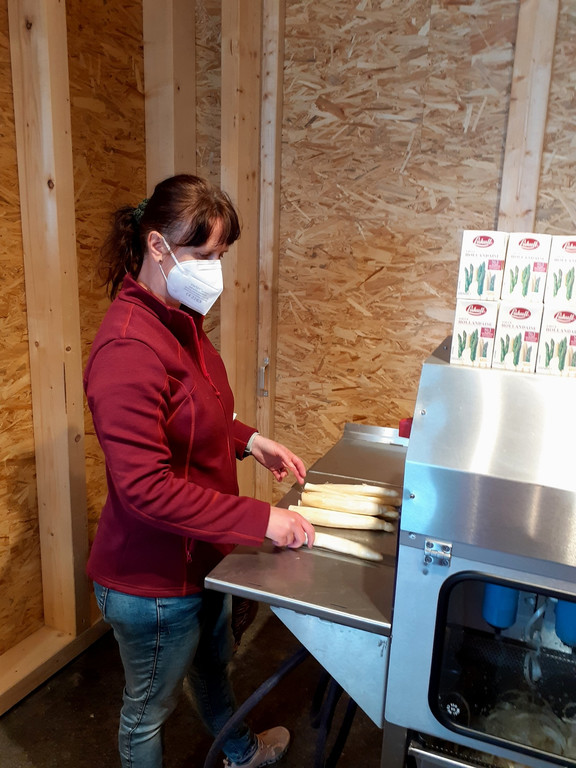 Spargel-Zeit in der „Genusskiste“ im Obsthof Leiblachtal: Ob Hofspargel, Spargel Klasse 1 oder Grüner Spargel, mit der praktischen Spargelschälmaschine wird „das Spargelschälen“ leicht gemacht.
