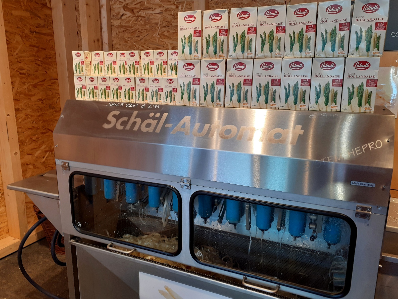 Spargel-Zeit in der „Genusskiste“ im Obsthof Leiblachtal: Ob Hofspargel, Spargel Klasse 1 oder Grüner Spargel, mit der praktischen Spargelschälmaschine wird „das Spargelschälen“ leicht gemacht.