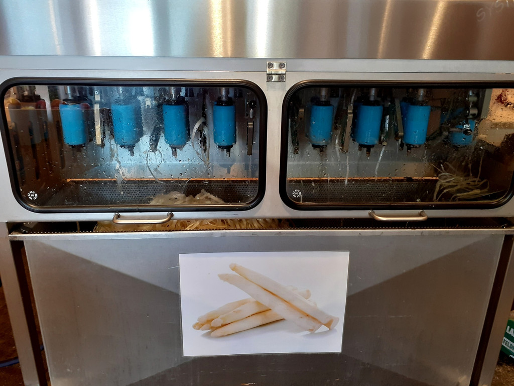 Spargel-Zeit in der „Genusskiste“ im Obsthof Leiblachtal: Ob Hofspargel, Spargel Klasse 1 oder Grüner Spargel, mit der praktischen Spargelschälmaschine wird „das Spargelschälen“ leicht gemacht.