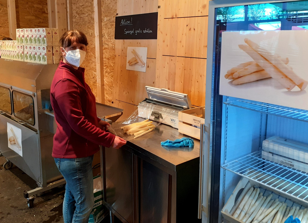 Spargel-Zeit in der „Genusskiste“ im Obsthof Leiblachtal: Ob Hofspargel, Spargel Klasse 1 oder Grüner Spargel, mit der praktischen Spargelschälmaschine wird „das Spargelschälen“ leicht gemacht.