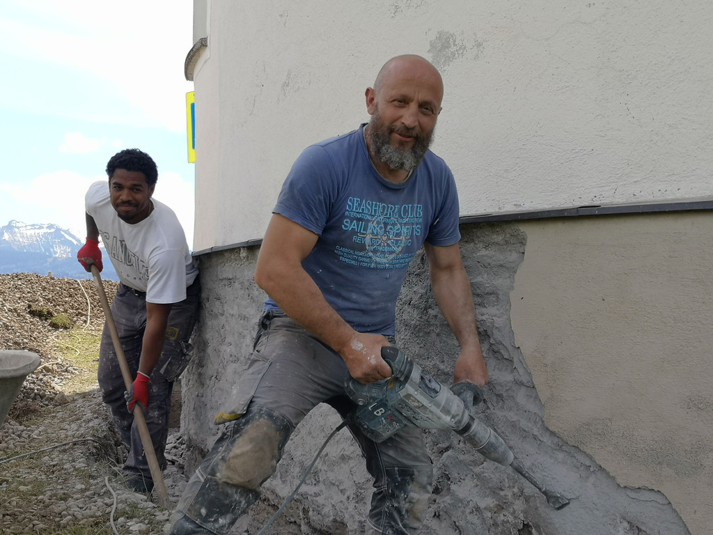 Der Verputz im Sockelbereich wird entfernt und erneuert.