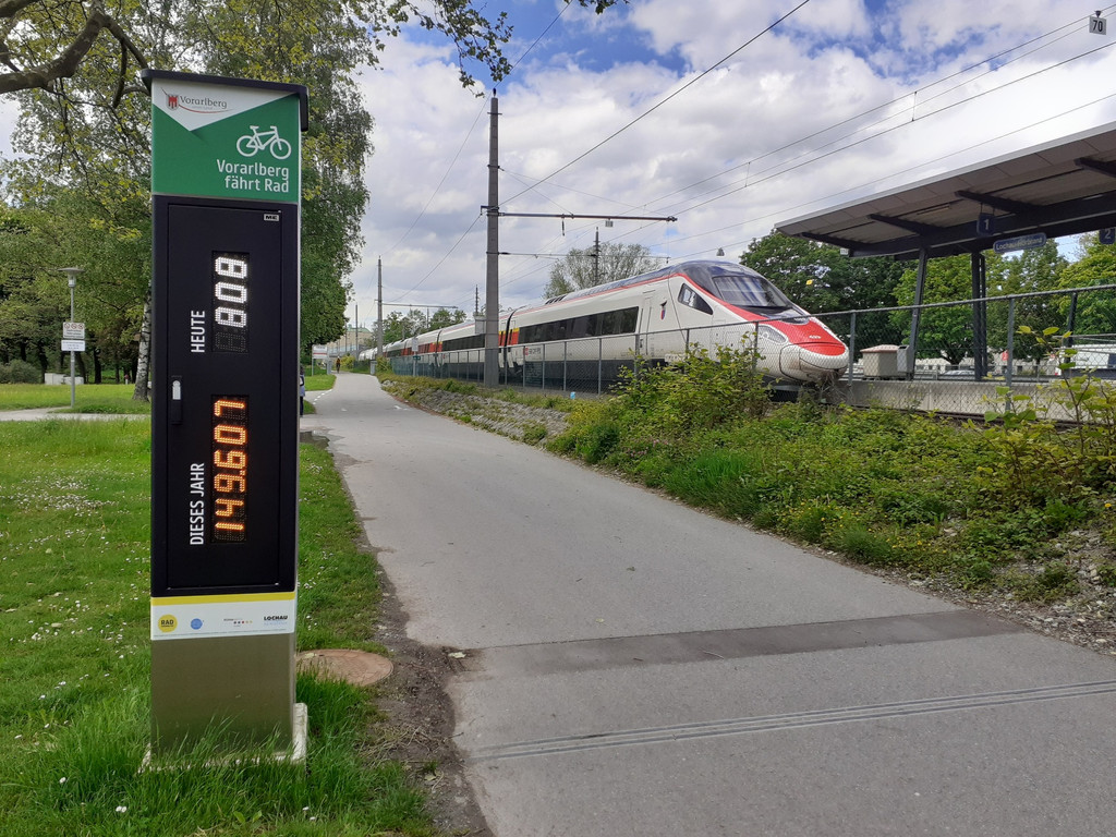 Die neue Radzählstelle mit Radbarometer am Bodensee-Radweg im Bereich der Lochauer Hafenanlage: Aktueller Stand am 25. Mai 2021 - 149.600 Durchfahrten seit Mitte November 2020.
