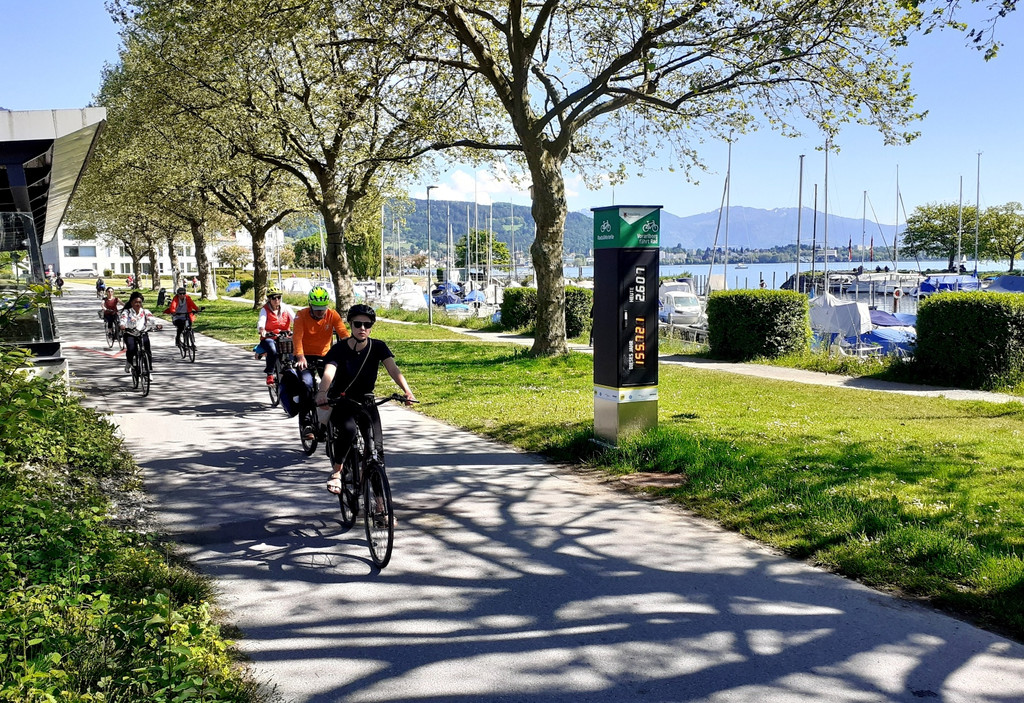 Die neue Radzählstelle mit Radbarometer am Bodensee-Radweg im Bereich der Lochauer Hafenanlage: Aktueller Stand am 28. Mai 2021 - 155.700 Durchfahrten seit Mitte November 2020.