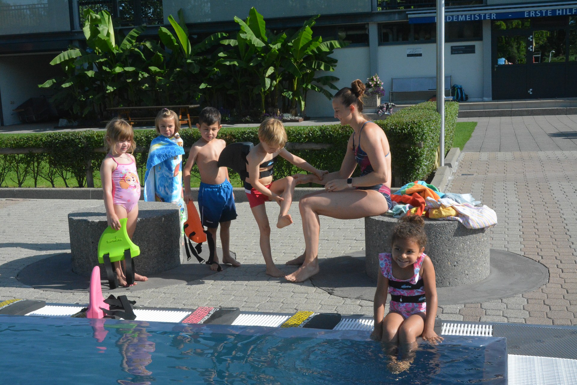Jedes Kind erhält von Wiedemann eine Haifischflosse, um damit das Schwimmen lernen zu können.