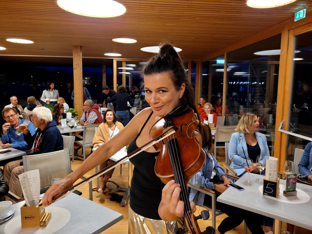 Lochauer Nacht der Musik: Auf dem Badehaus des Seehotel Am Kaiserstrand sorgte „Barbara Helfgott“ mit ihrer Violine für beste Stimmung.