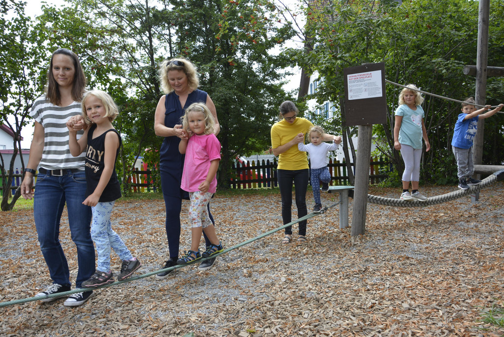 Spiel und Spaß mit anderen Kindern erleben. Auf dem Spielplatz der VS Haselstauden helfen die Mamas beim Balancieren.