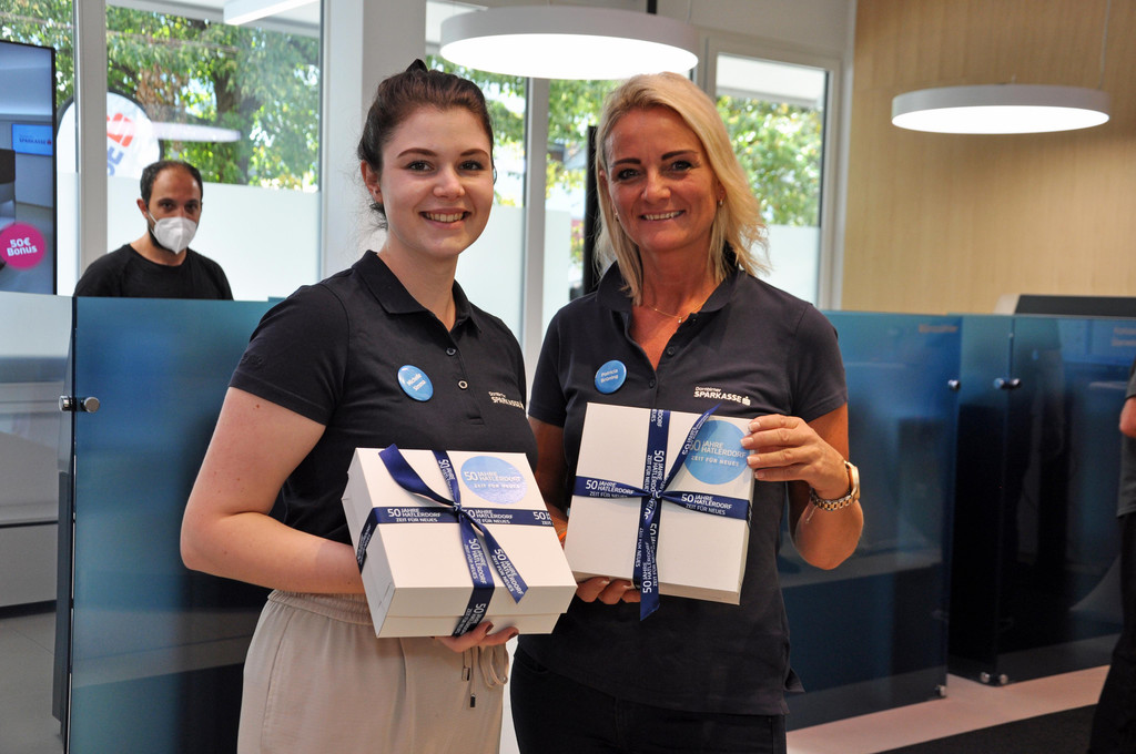 Für alle Besucher gab es als Geschenk eine leckere Sachertorte – hier überreicht von Michelle Simma und Patricia Brüning.
