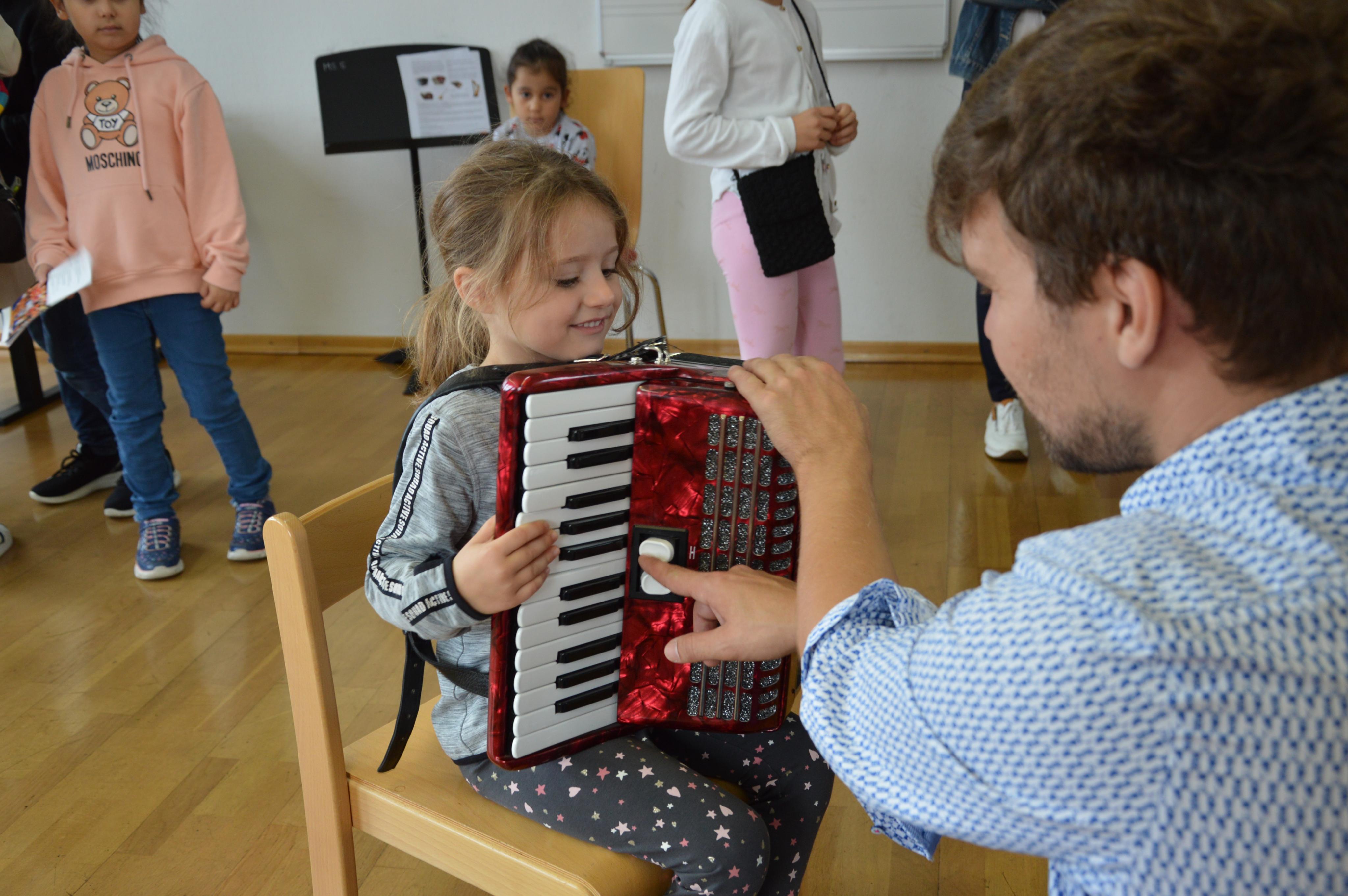 Greta Peintner versucht sich auf dem großen Akkordeon (Lehrer Denaj Kriclic)