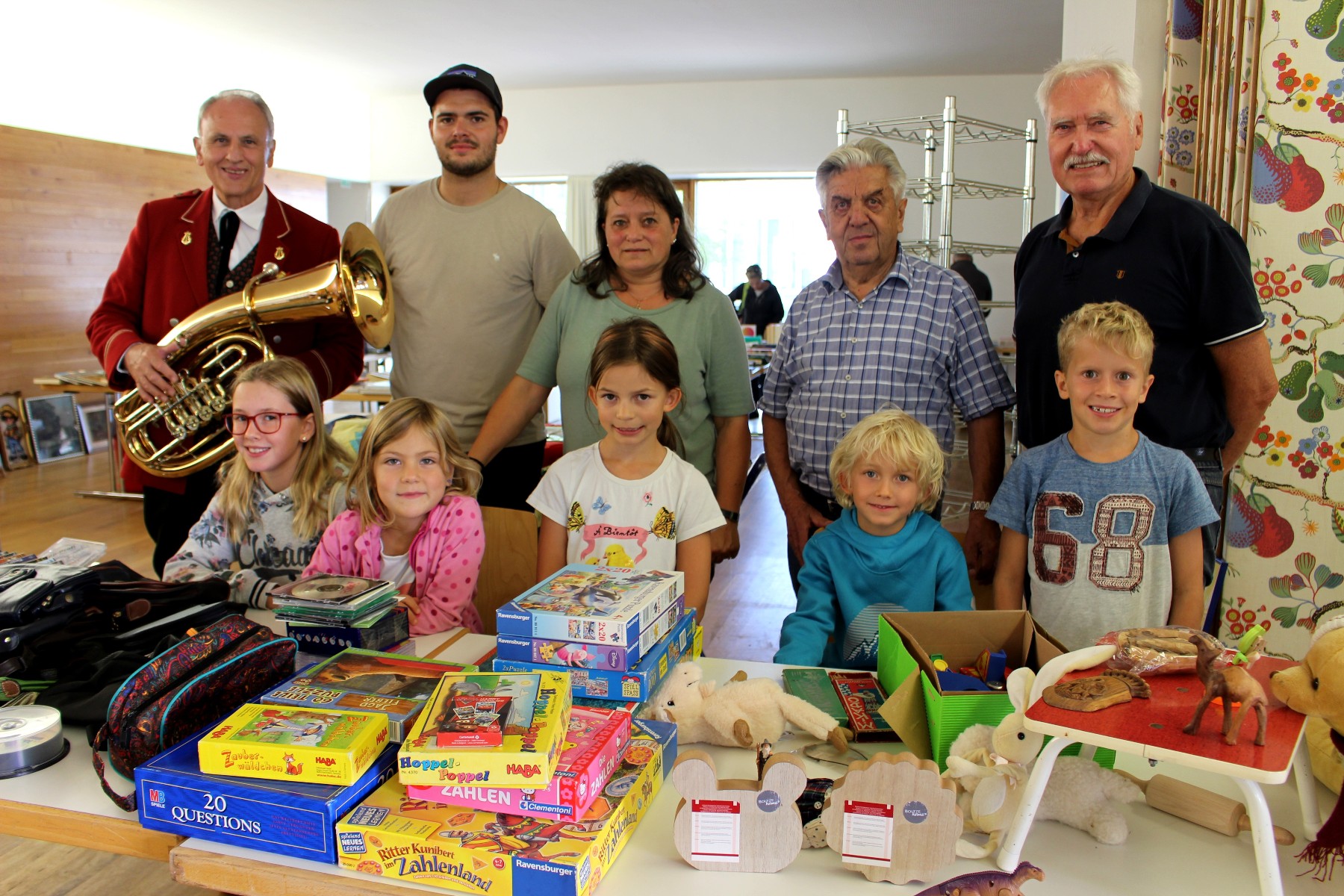 Zusammen konnte man sich über ein bestens gelungenes pfarrliches Flohmarkt-Festle freuen: Ehrenvorstand Wolfram Baldauf, Daniel Reichart, Sonja Reichart, Robert Stefani, Siegfried Kern und einige der jungen Flohmarktverkäufer.