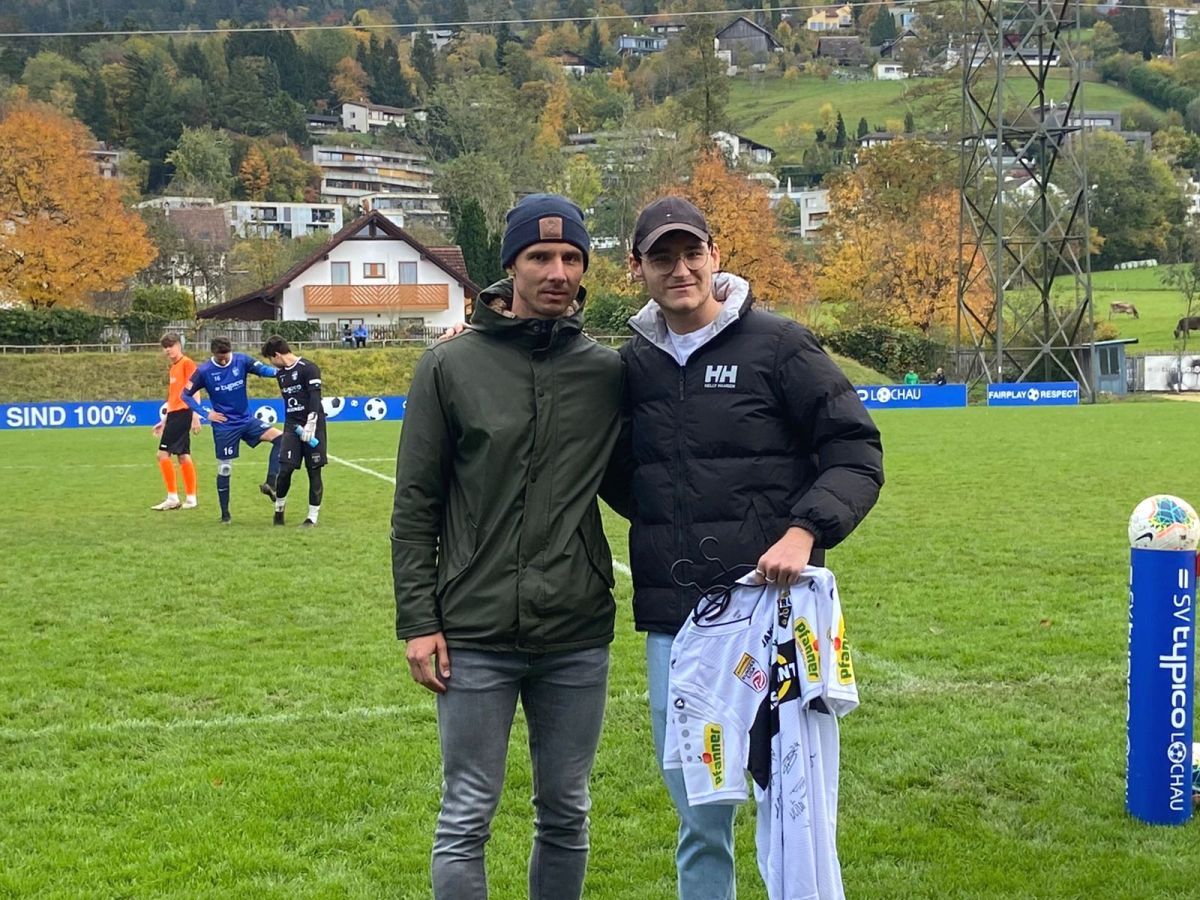 SCR Altach Kapitän Philipp Netzer überreichte zwei Originaltrikots mit Unterschriften vom gesamten Team an Christoph Malin.