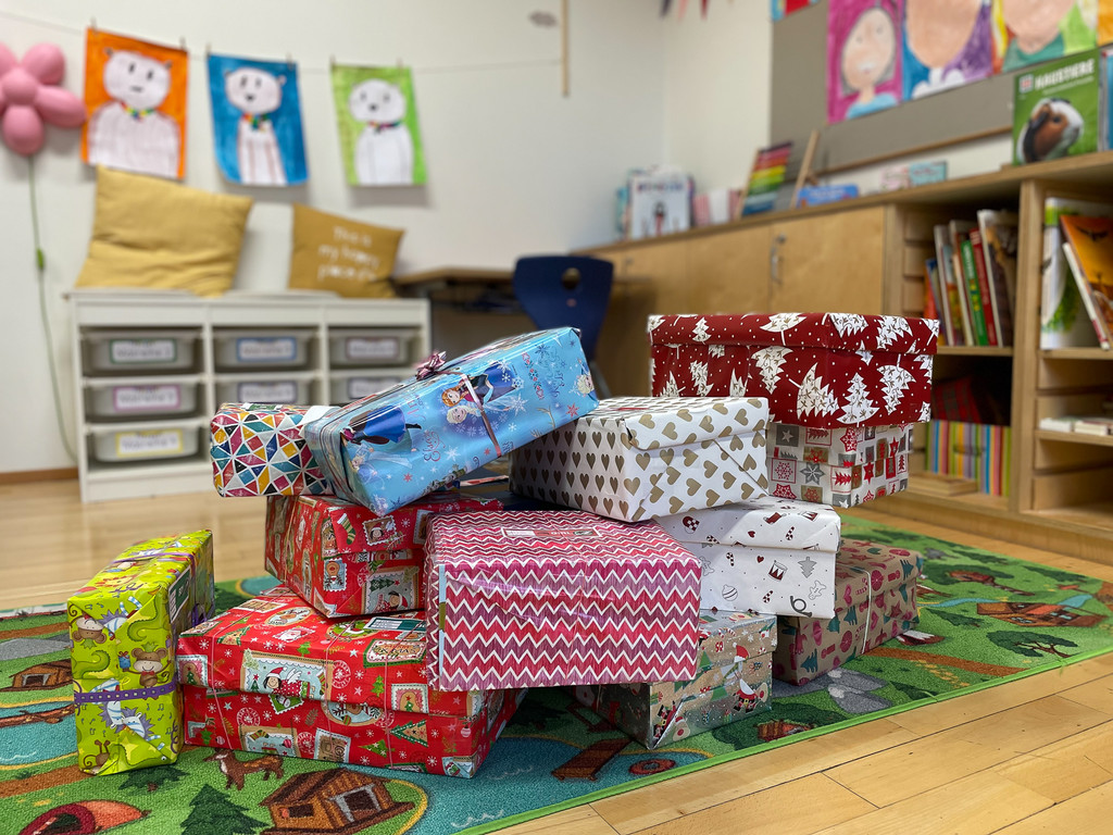 Viele wunderschön verpackte Geschenke stapeln sich in den Klassenzimmern der Volksschule Mehrerau.