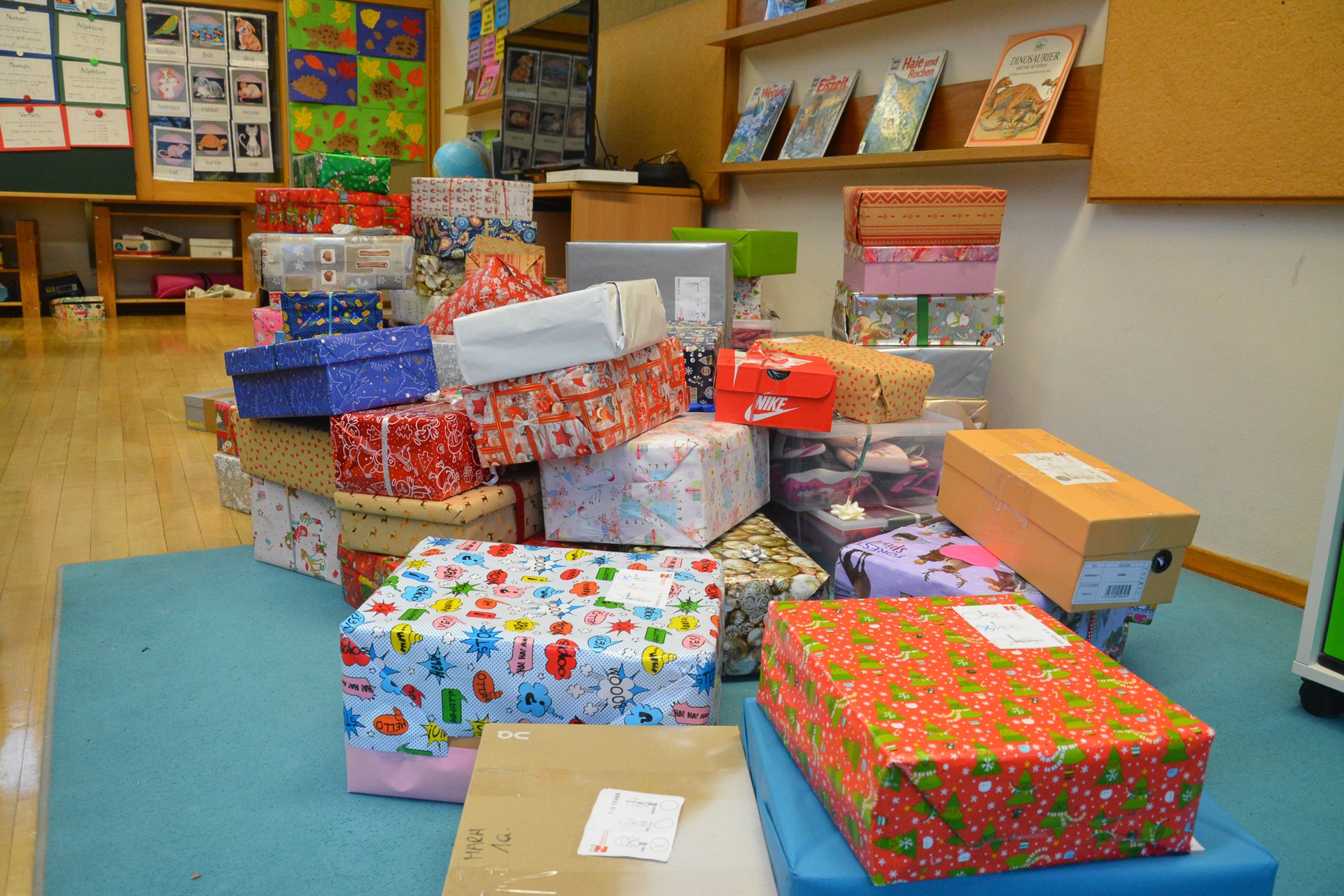 In der Klasse der 3c wurden alle Geschenke der gesamten Schule gesammelt.