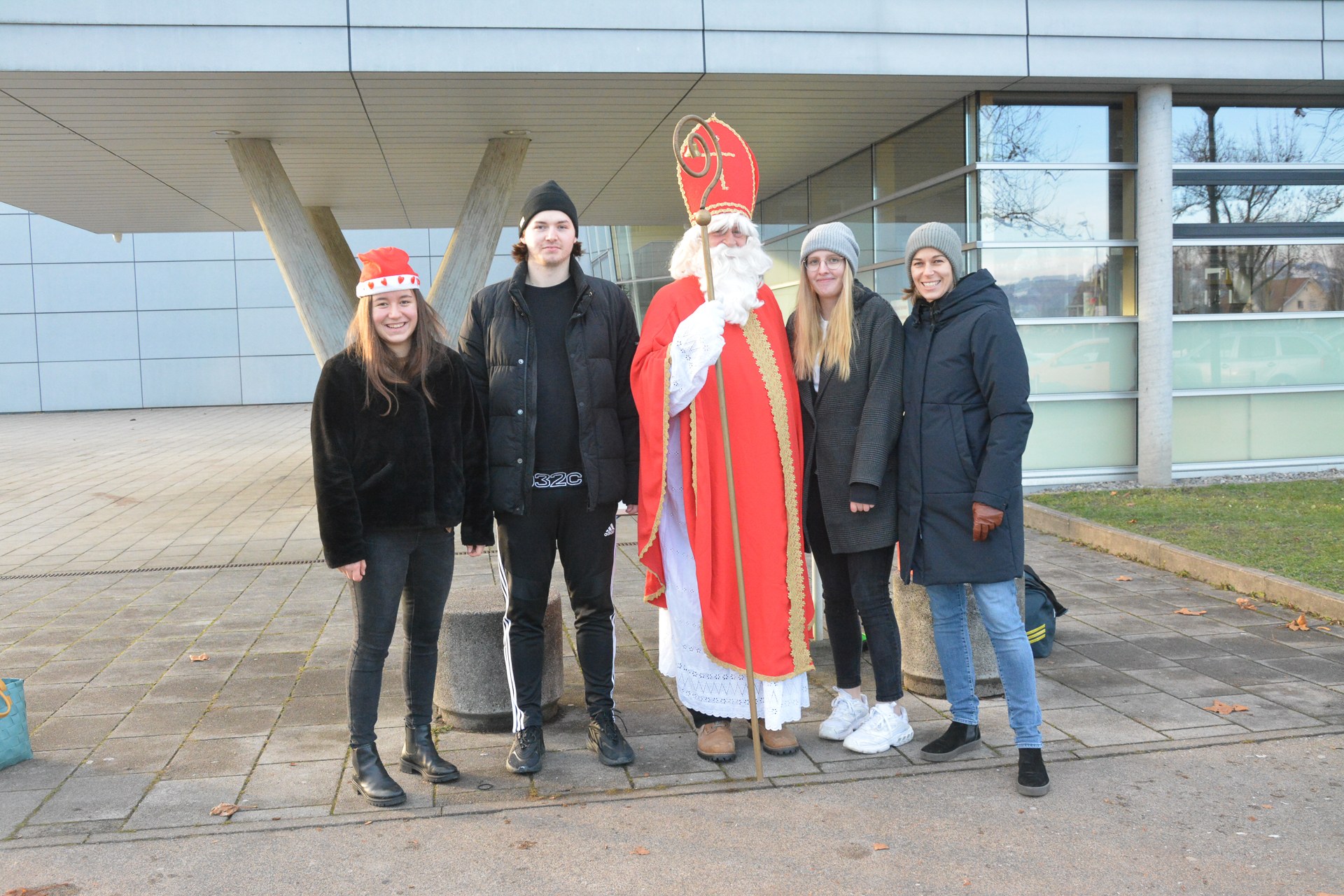 Lara König, Linus Hagspiel, Nikolaus, Jessica Collini und Nadine Peschl (v.l.nr.) bescherten den Kindern mit dem Nikolaus-Drive-In große Freude.
