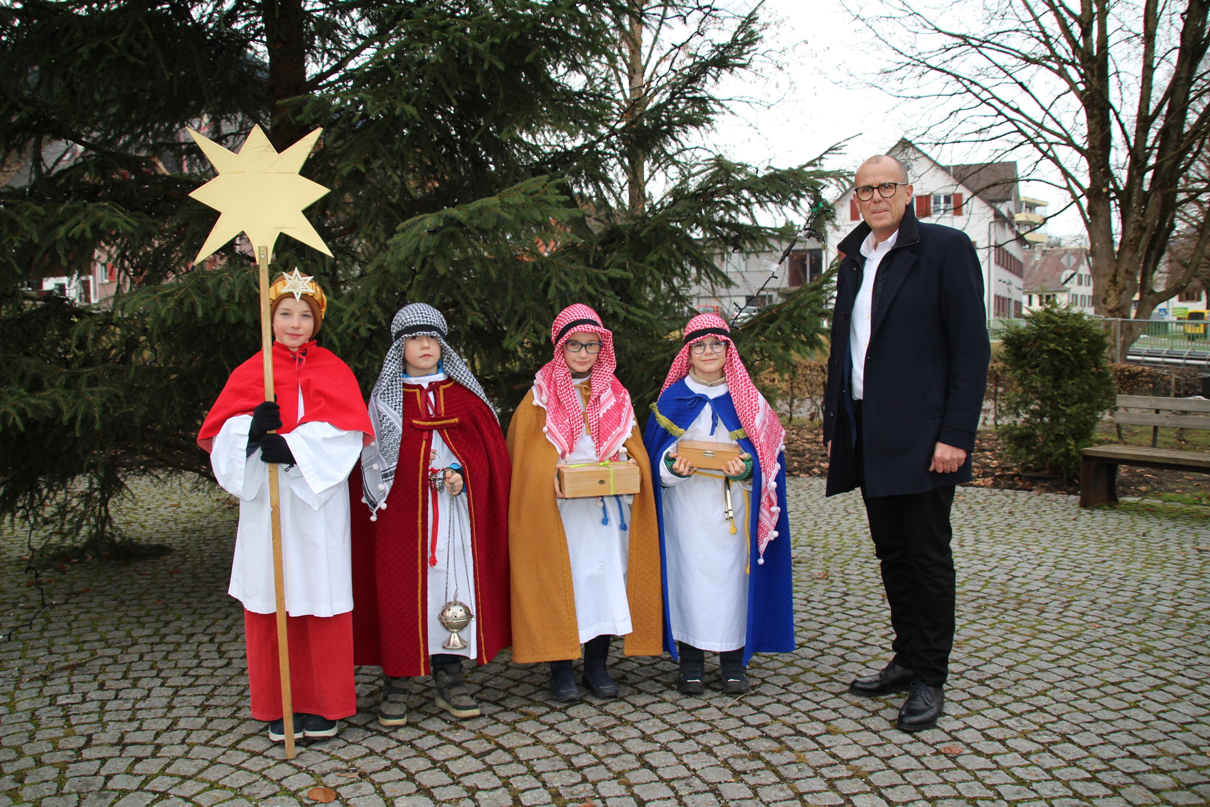 Moritz, Menegild, Amelie und Tobias als Sternsinger beim Bürgermeister