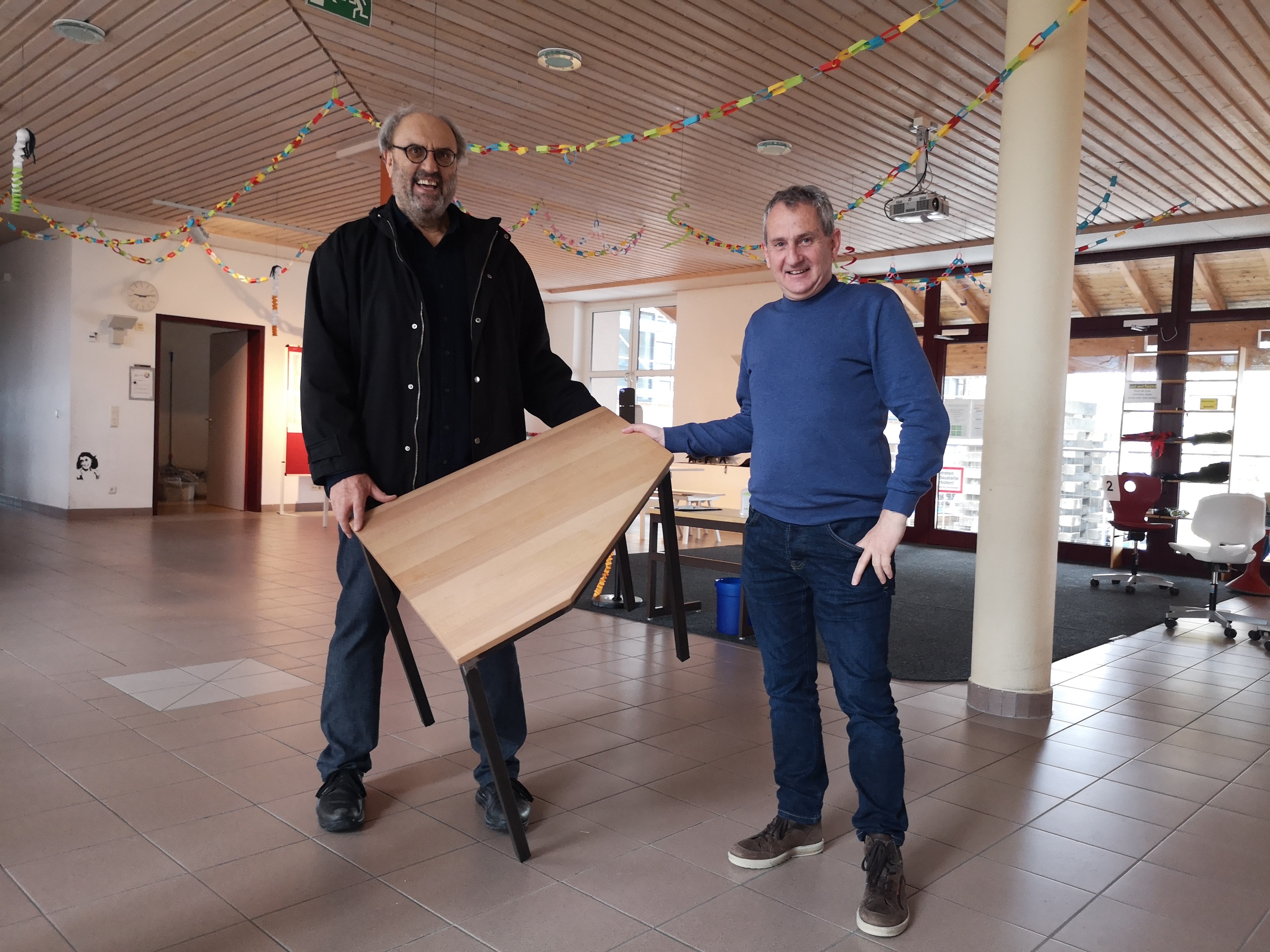 Hanno Metzler und Direktor Melchior Schwärzler präsentieren den Prototyp des neuen 5-Eck-Tisches.