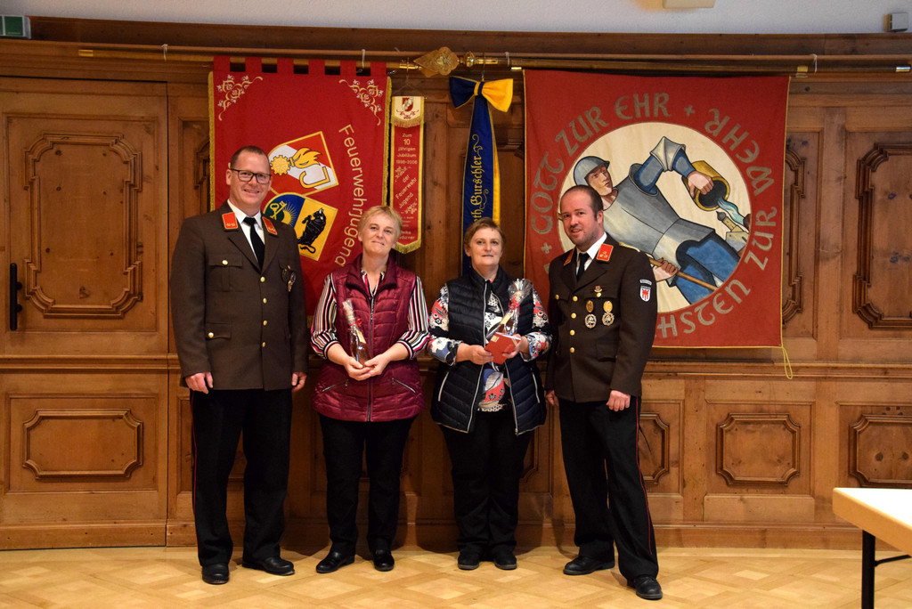 Vizekommandant Philipp Neyer und Kommandant Lukas Beck mit Lydia und Anita, die sich um das leibliche Wohl der Feuerwehrleute kümmern.