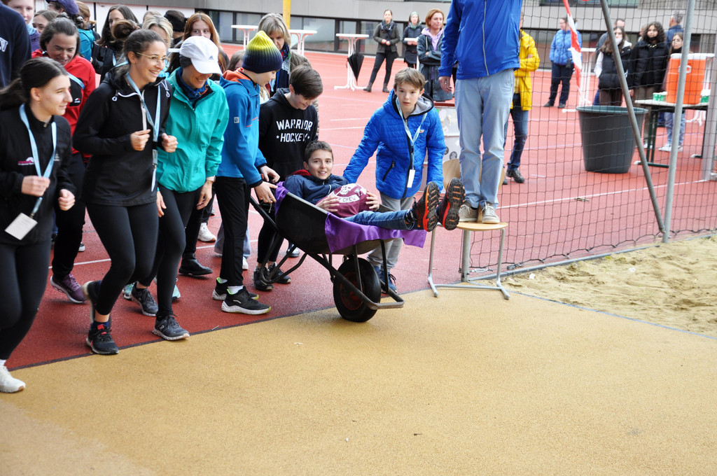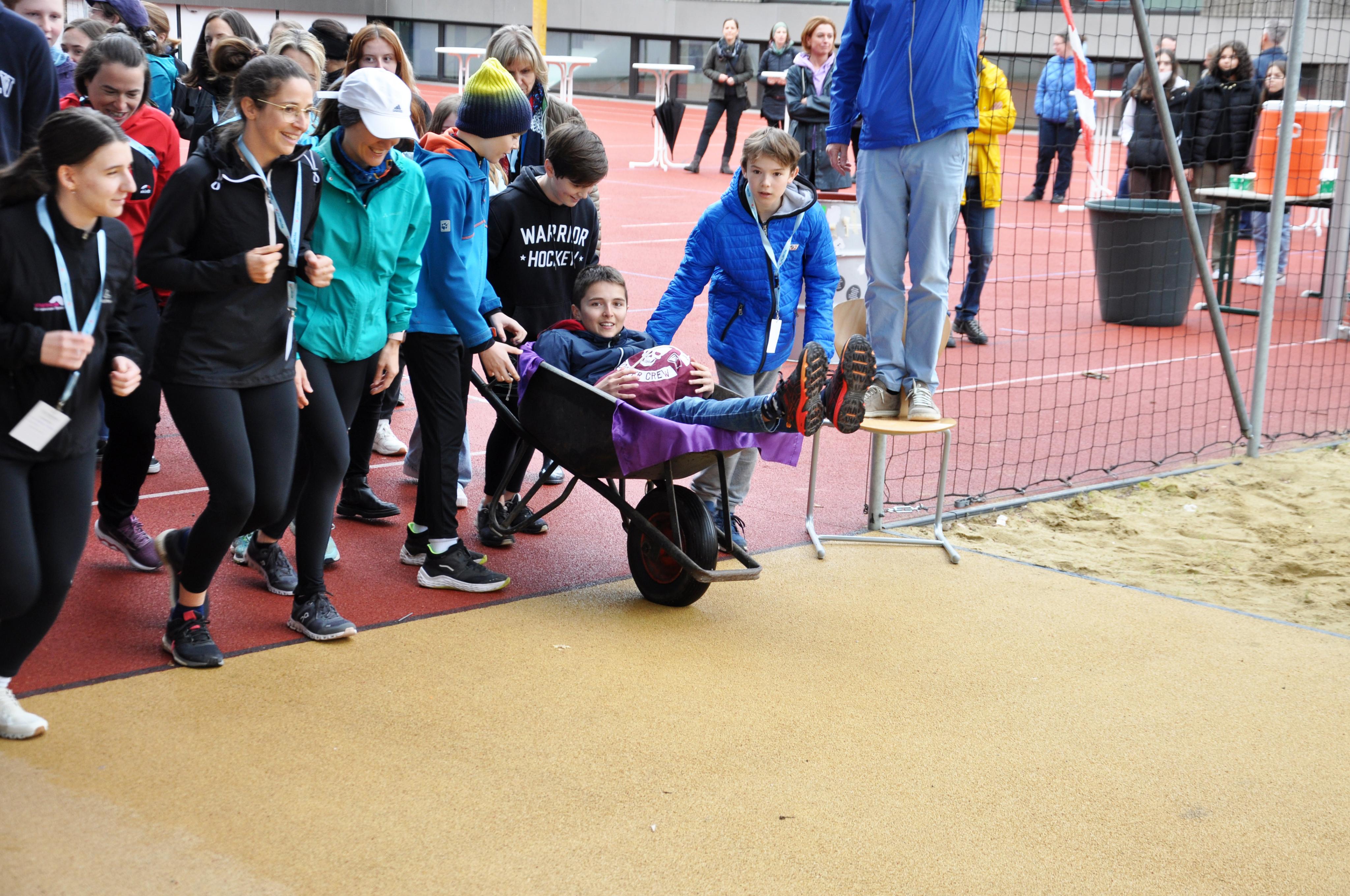 Die Schüler wollten ihren verletzten Mitschüler unbedingt mit dabei haben und organisierten kurzerhand eine Schubkarre.
