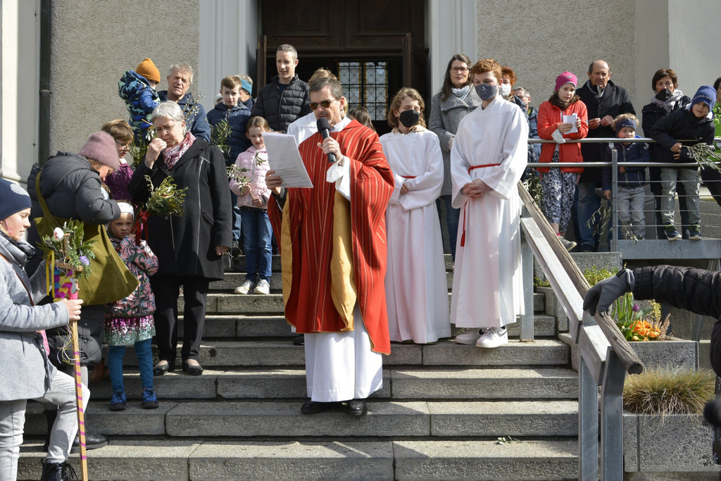 Pfarrer Christian Stranz bei der Segnung der Zweige und Palmbuschen.