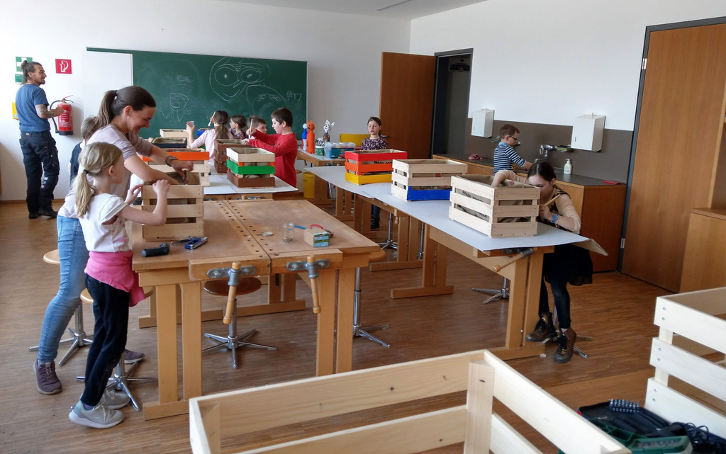 Im Bucher Werkraum stand kürzlich eine kleine Holzkiste die selbst zusammengebaut und nachfolgend bepflanzt wird im Mittelpunkt.