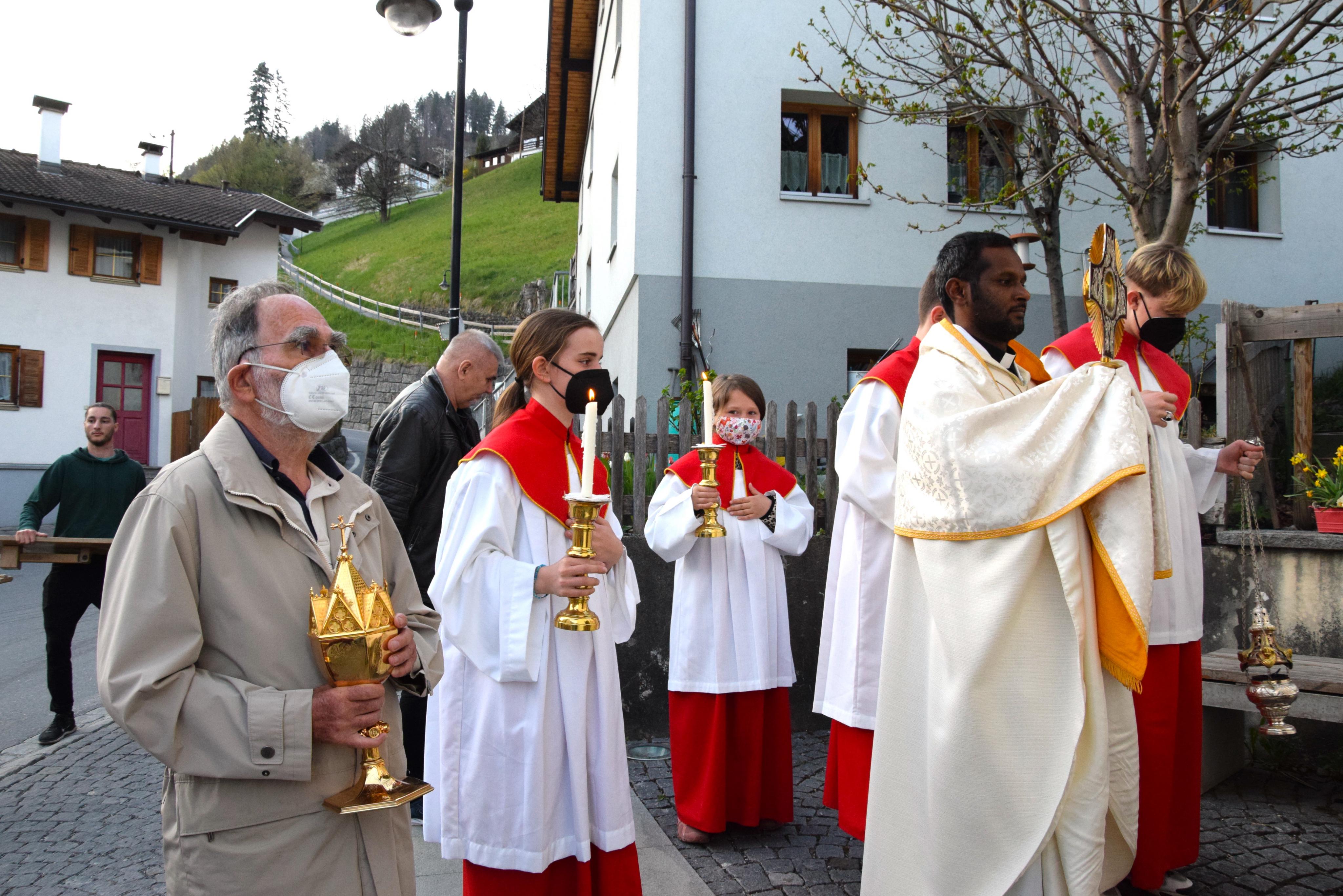 Kaplan Albert Joseph Jesuraj überträgt das Allerheiligste in die Litzkapelle, wo es bis kurz vor der Osternachtfeier aufbewahrt wird. Danach wird es ins Münster zurück gebracht.