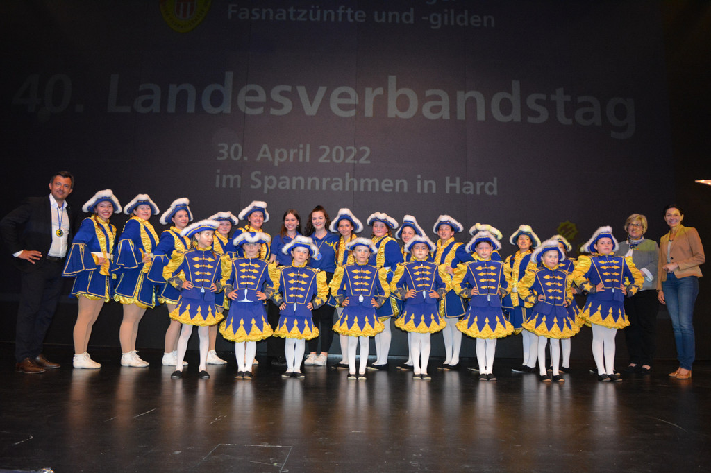 Die Mufängar Garde mit Bürgermeister Martin Staudinger, LR Martina Rüscher, NEG-Präsidentin Petra Müller (2.v.r.) gemeinsam mit den Gardetrainerinnen Elisa Kleiner und Laetizia Mastrangelo (Bildmitte)