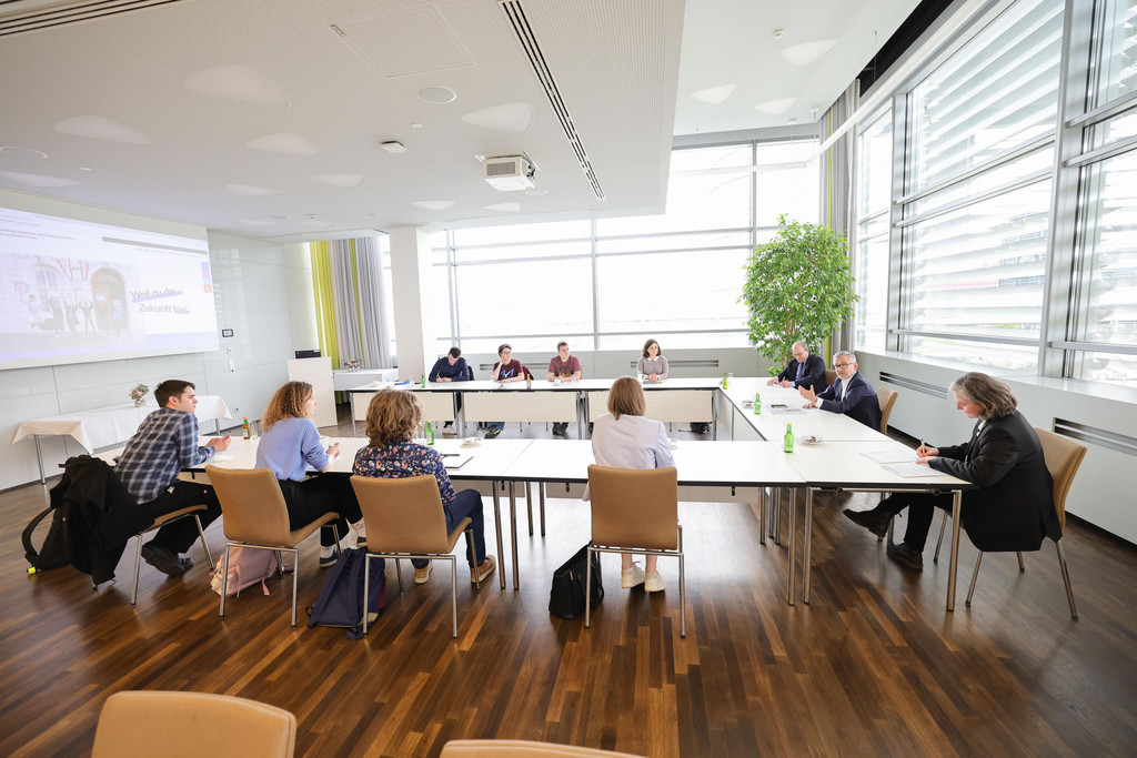 Im Rahmen eines Studienstiftungsgesprächs trafen Marcel und Julian auf den Vorstandsvorsitzenden der voestalpine Herbert Eibensteiner. © ÖAW, Daniel Hinterramskogler