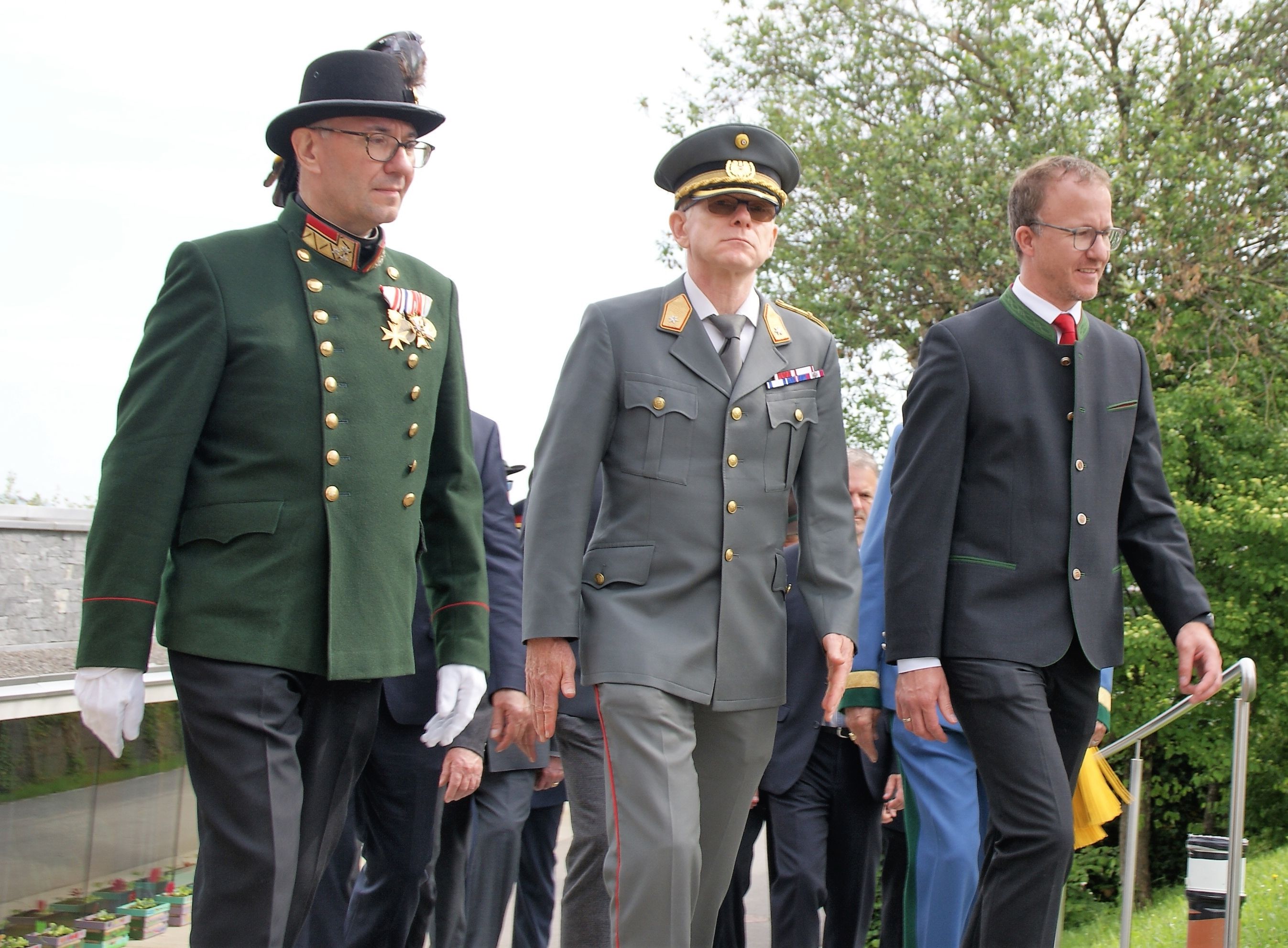 Landespräsident Alwin Denz (li.), Militärkommandant Günther Hessel und LR Christian Gantner beim Festzug in Buch