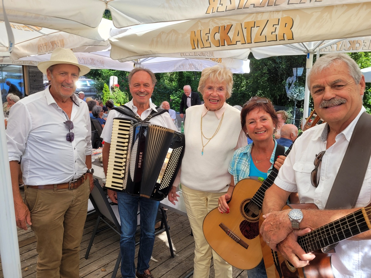 Als Ehrengast mit dabei auch die Tochter von Franz Winkler, Olga Homann, im Bild mit Xaver Sinz und den Musikanten von „Mangold 3“.