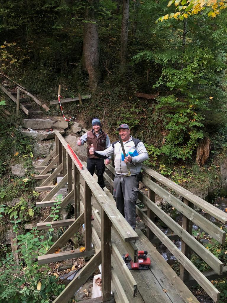 Erfolgreiche, ehrenamtliche Initiative zur Neuerrichtung der Fußwegbrücke über den Lutzenreuter Bach, Teil eines gerne begangenen Rundweges im Wandergebiet Eichenberg.