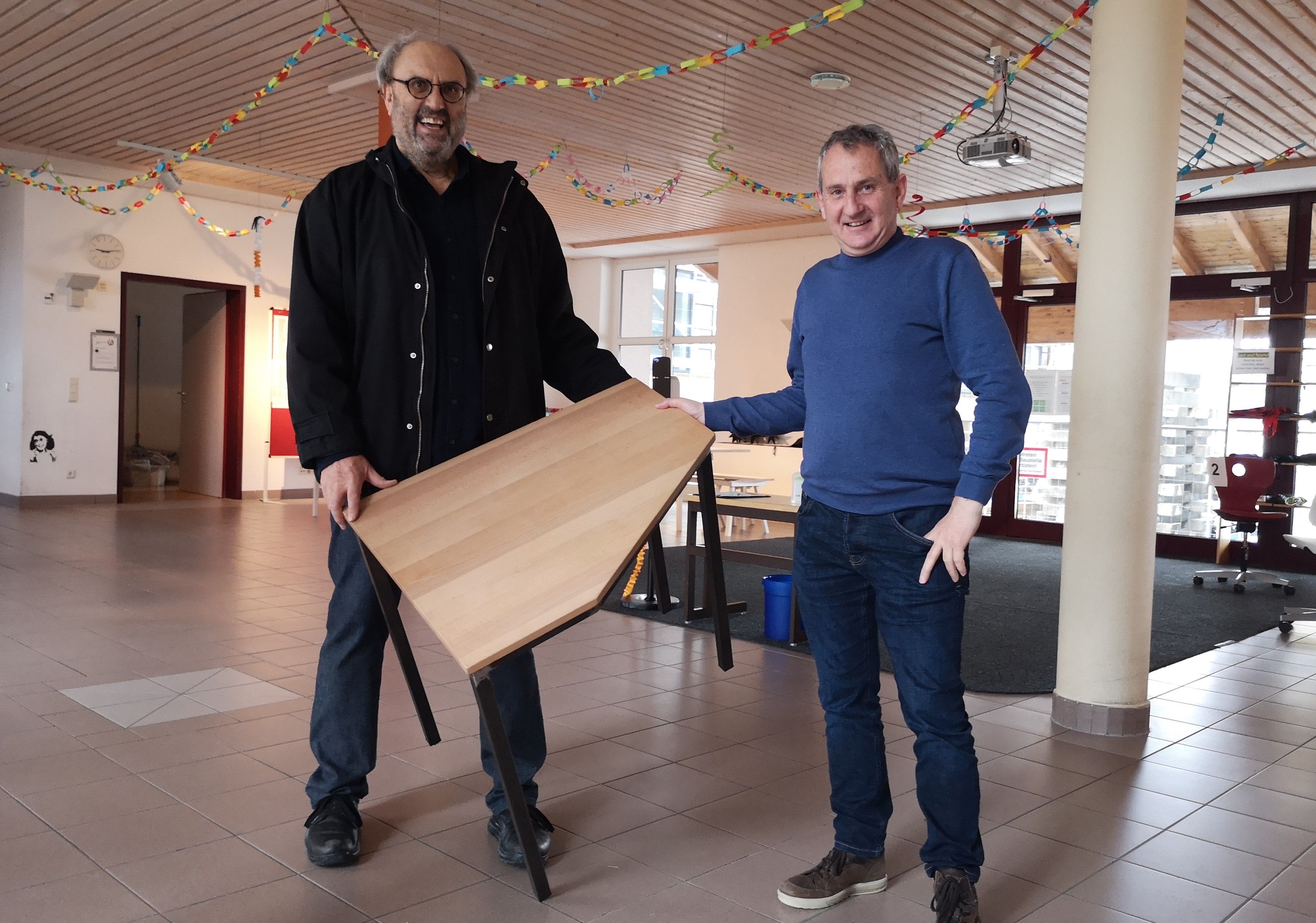 Hanno Metzler und Direktor Melchior Schwärzler mit dem neuen 5-Eck-Tisch.