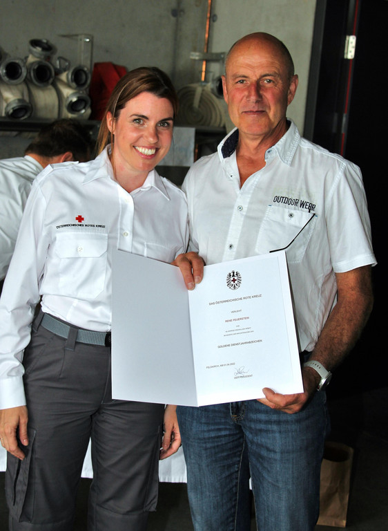 Der ehemalige Ortsstellenleiter Rene Feuerstein erhielt für seine 40-jährige Tätigkeit bei RK Buch das „goldene Dienstjahrabzeichen“