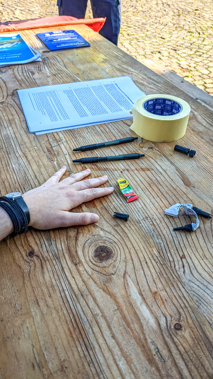 Aktivisten kleben sich vor Landhaus an Tisch