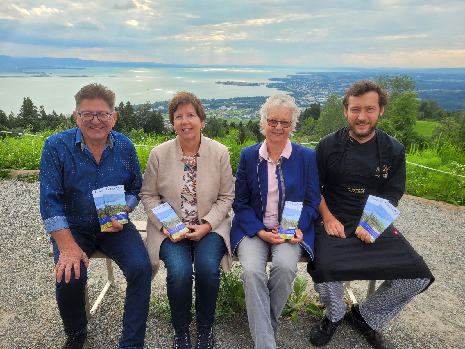 Eichenberg-Tourismus-Obmann Hermann Gmeiner, Irmgard Innauer, Marlene Sohler und Vize-Obmann Jeremias Hehle, Juniorchef vom Hotel Schönblick präsentieren die neu gestaltete „Gäste-Info Eichenberg 2022 – 2024“.