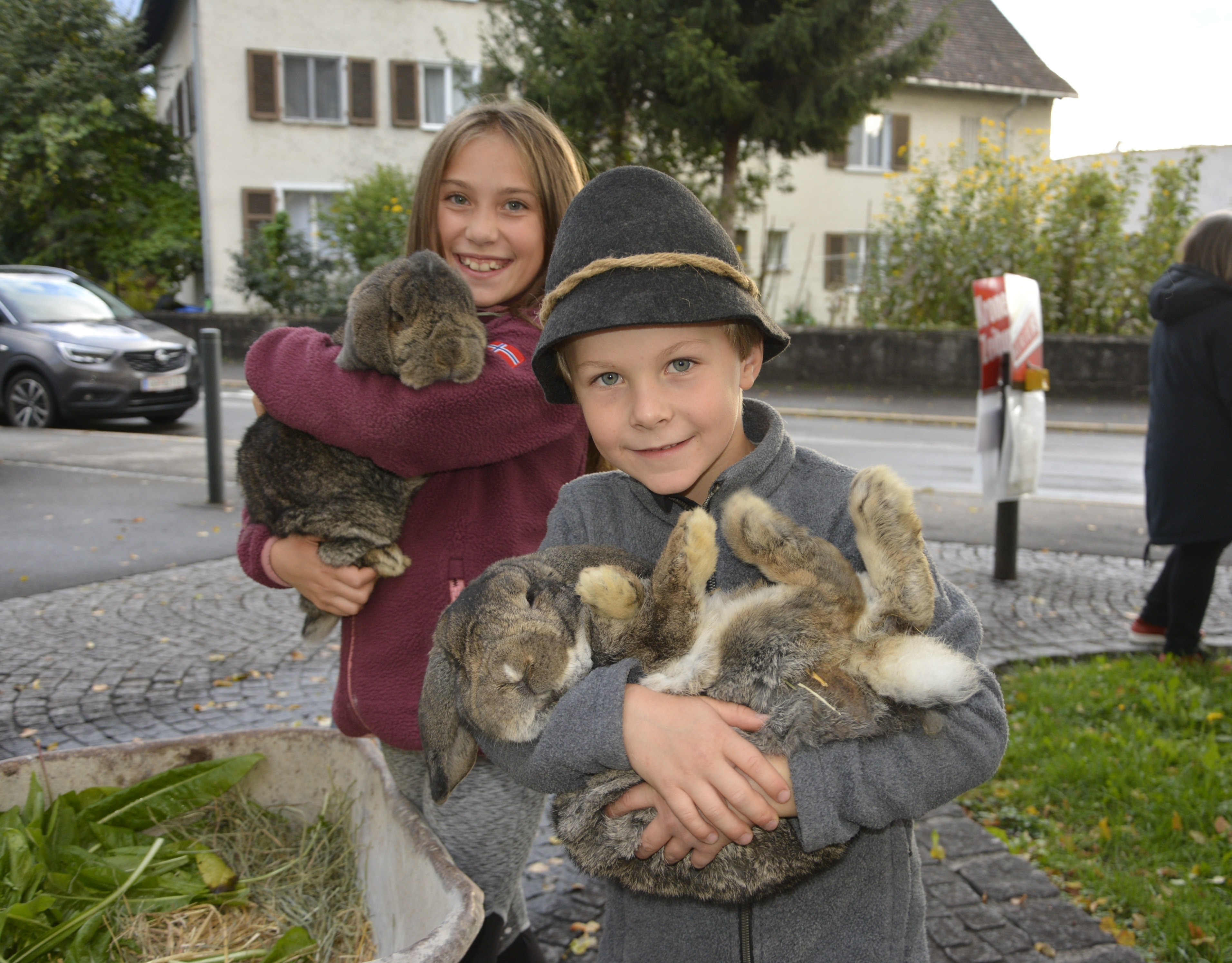 Diese Kinder brachten ihre vierbeinigen Lieblinge in einer Schubkarre, gepolstert mit Heu und Gras, zur Segnung mit.