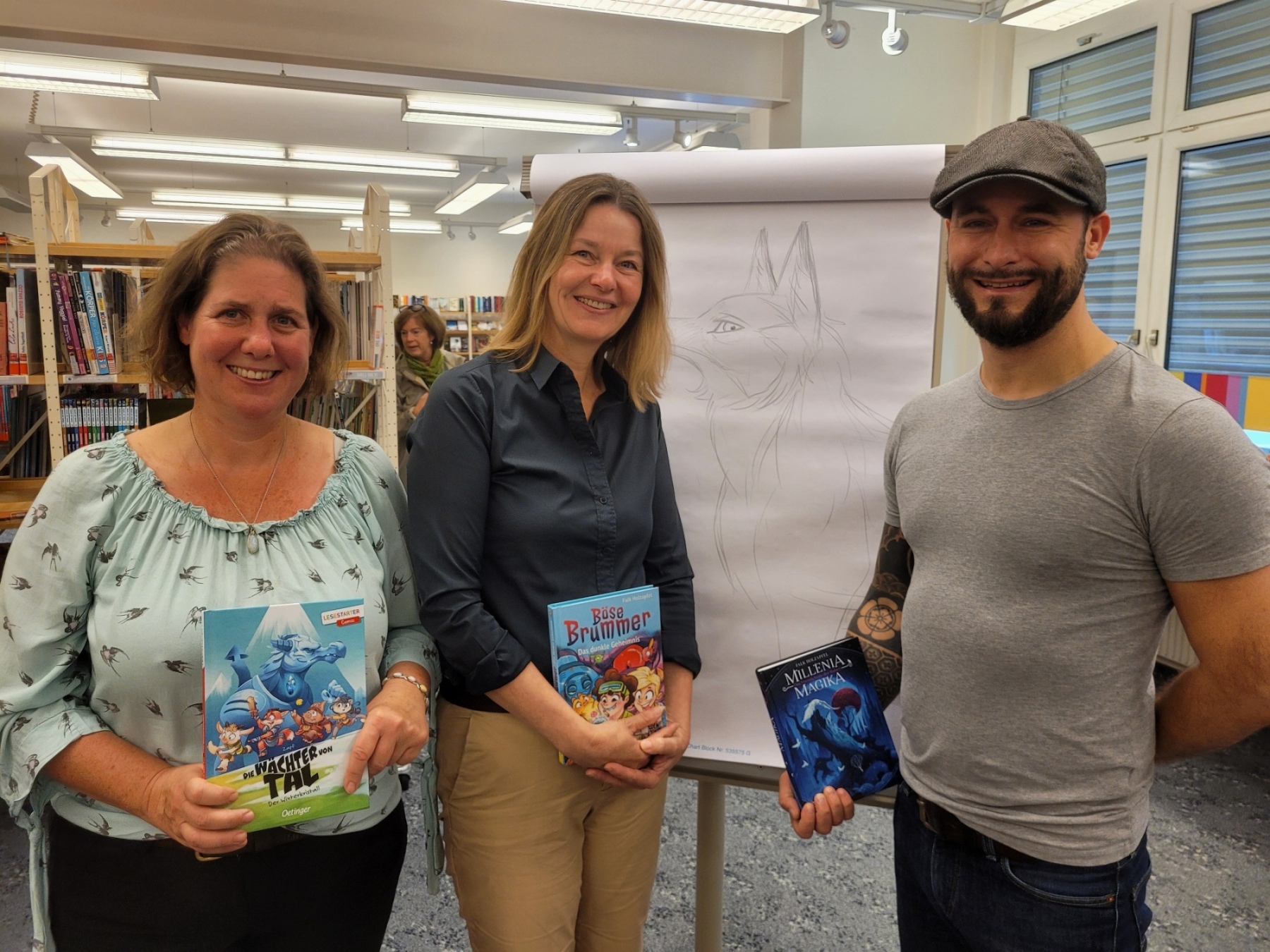 Schulbibliothekarin Christine Swoboda und Büchereileiterin Birgit Lechner mit dem Kinder- und Jugendbuchautor Falk „Zapf“ Holzapfel.
